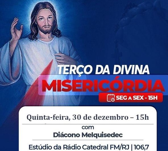 Você já sabe, a Rádio Catedral te convida a rezar conosco todos os dias o Terço da Misericórdia, sempre às 15h. Hoje, o terço será rezado dos nossos estúdios, conduzido pelo diácono Melquisedec, e amanhã, como ocorre todas as sextas-feiras, ele é rezado no Santuário da Divina Misericórdia, em Vila Valqueire, com o padre João…