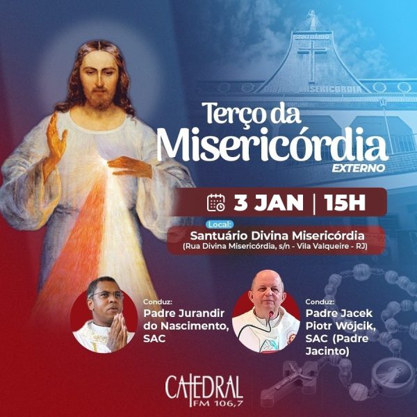 Terço da Divina Misericórdia, conduzido pelos Padres Jacinto e Jurandi, nesta sexta-feira, dia 03 de janeiro, diretamente do Santuário da Divina Misericórdia – Vila Valqueire – Rio de Janeiro