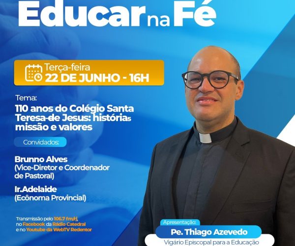 Nesta terça-feira, a Rádio Catedral vai transmitir o programa especial Educar na Fé. O padre Thiago Azevedo, Vigário Episcopal para a Educação, vai receber Brunno Alves, Vice-Diretor e Coordenador de Pastoral, e a irmã Adelaide, Ecônoma Provincial, que vão falar sobre “Os 110 anos do Colégio Santa Teresa de Jesus: histórias, missão e valores”. O…