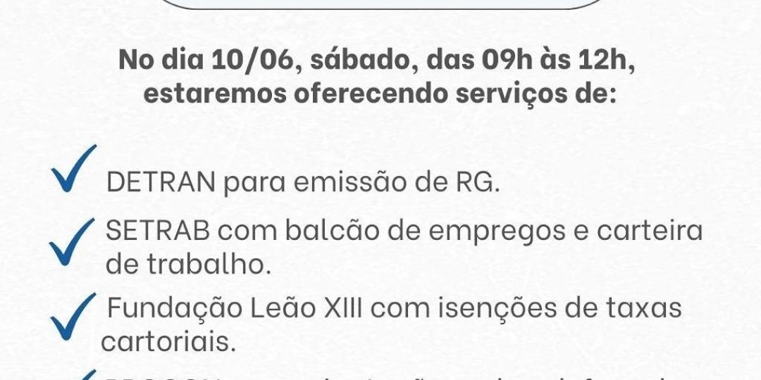 A Paróquia São Pedro do Mar, no Recreio dos Bandeirantes, está organizando uma ação social no sábado, 10 de junho. São os seguintes os serviços que serão oferecidos: emissão de RG pelo Detran, balcão de emprego e carteira de trabalho pela Secretaria Estadual de Trabalho e Renda, isenções de taxas cartoriais pela Fundação Leão XIII, e orientação sobre defesa do consumidor pelo Procon.