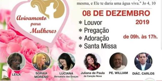 A Paróquia Santa Bárbara e Santa Cecília, em Vigário Geral, promoverá neste domingo, dia 8, um Avivamento para Mulheres. Vai ser das 9h às 17, com louvor, pregação, adoração ao Santíssimo Sacramento e a santa missa. Informações e inscrições na secretaria da igreja, na Rua Alvarenga Peixoto, 155.