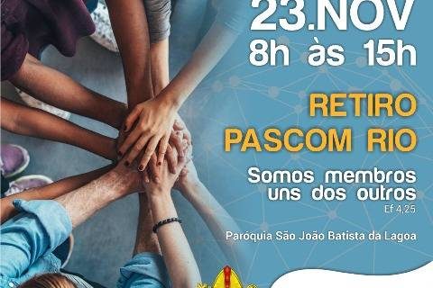 Veja maisContinuam abertas as inscrições para o retiro da Pascom Rio, no sábado, dia 23, das 8h às 15h. Com o tema “Somos membros uns dos outros”, o retiro vai ser na Paróquia São João Batista da Lagoa, em Botafogo. As inscrições estão sendo feitas no facebook e instagram da Pascom Rio.