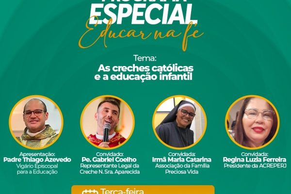 A Rádio Catedral e a WebTV Redentor transmitem hoje mais um programa Educar na Fé, do Vicariato Episcopal para a Educação. O padre Jorge Luiz Vieira, Vigário Episcopal adjunto para a Educação, e psicólogo, vai receber a doutora em educação, professora Mychelyne Ferreira, e a psicóloga Monique Bernardi, para conversarem sobre o diálogo entre educação…