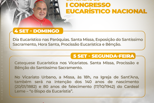 Dentro das celebrações do centenário do Congresso Eucarístico do Rio de Janeiro, que está sendo realizado a nível paroquial, vicarial e arquidiocesano, amanhã vai ter a Jornada Teológico-Eucarística, organizado pelo departamento de teologia da Puc. Com o tema “Pão em todas as mesas”, a jornada será das 8h30 às 17h, presencial e também transmitida pela…