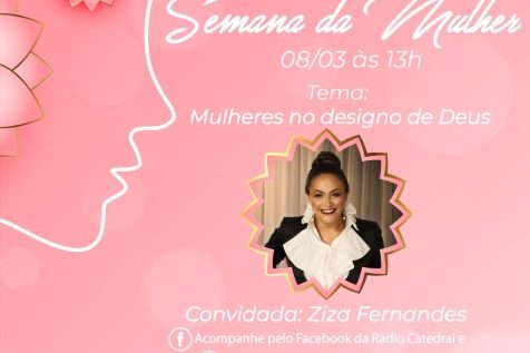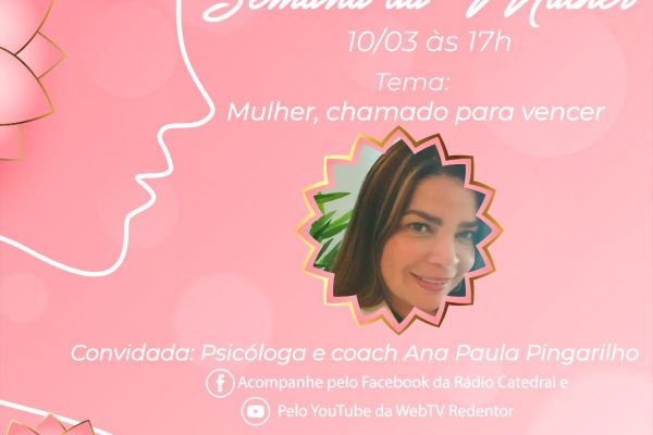 A Rádio Catedral e a WebTV Redentor continuam hoje com a série de lives que estão apresentando nesta semana, pela Semana da Mulher. Hoje, às 17h, a psicóloga e coach Ana Paula Pingarilho vai falar sobre “Mulher, chamado para vencer”. Acompanhe pelo Facebook da Rádio Catedral, ou pelo Youtube da WebTV Redentor