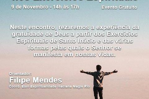O Centro Loyola de Fé e Cultura convida a todos a fazer uma experiência da oração inaciana, “A gratuidade de Deus nos Exercícios Espirituais”. Ela será realizada no dia 9 de novembro, das 14h às 17h, com Felipe Mendes, que é o coordenador do Eixo Espiritualidade Inaciana Magis Rio. O local vai ser na sede…