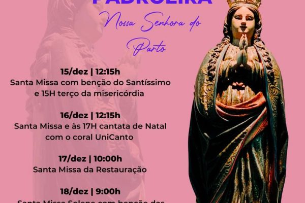 A Igreja Nossa Senhora do Parto já tem pronta a sua programação para a festa da padroeira. No dia 15 de dezembro, às 12h15, será celebrada a missa com e bênção do Santíssimo Sacramento, e às 15h, será rezado o Terço da Misericórdia. No dia 16 de dezembro, às 12h15, será celebrada a Santa Missa,…