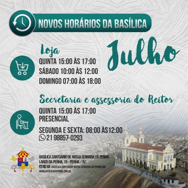 Voltamos lembrar o horário de funcionamento da Basílica Santuário Nossa Senhora da Penha neste mês de julho. A loja estará aberta na quinta-feira, das 15h às 17h, no sábado, das 10h às 12h, e no domingo, das 7h às 18h. A secretaria e assessoria do reitor estará aberta na quinta-feira, das 15h às 17h, ou…
