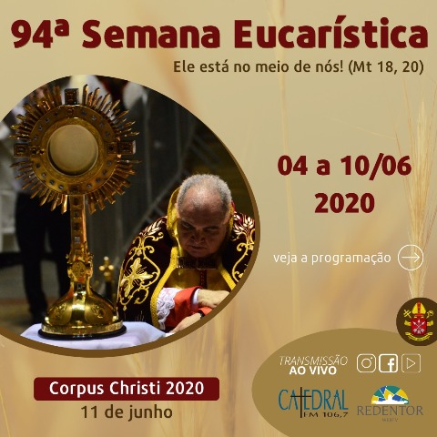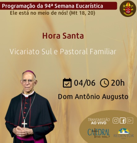 Nesta segunda-feira, 8 de junho, a Hora Santa da 94ª Semana Eucarística será presidida pelo Bispo Auxiliar, Dom Juarez Deloto. Será às 20h, voltada, principalmente, para o Vicariato Leopoldina, Pastoral Vocacional, Clubes Vocacionais, Animação Bíblica da Pastoral, Círculos Bíblicos, Pastoral Missionária e IAM. A Semana Eucarística, que prepara os fiéis para a festa de Corpus…