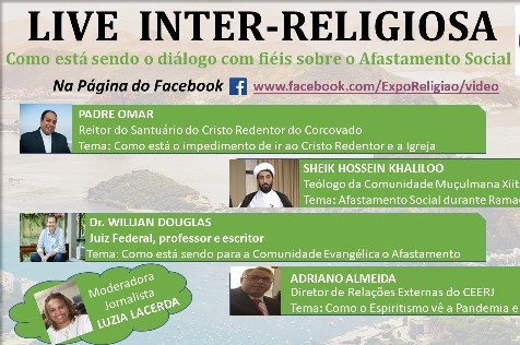 Uma live inter-religiosa será realizada na noite desta quarta-feira, pelo Facebook da Expo Religião. A live vai ao ar às 19h, e a igreja católica estará representada pelo reitor do Santuário Cristo Redentor, padre Omar Raposo. O endereço é www.facebook.com/ExpoReligiao/video