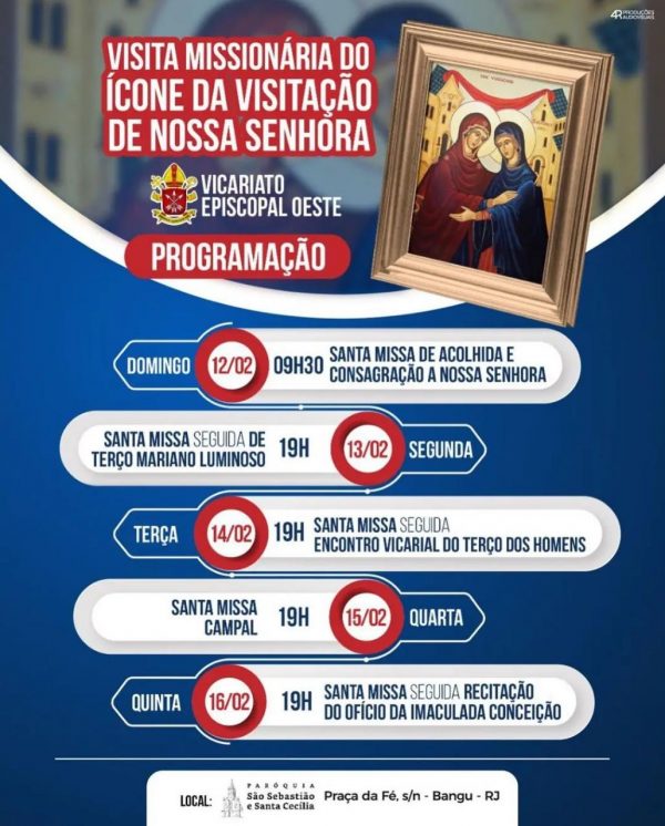O ícone de visitação de Nossa Senhora, que está visitando a Arquidiocese do Rio de Janeiro, está percorrendo nesta semana o Vicariato Oeste. Durante toda a semana ele se encontra na Paróquia São Sebastião e Santa Cecília, no bairro de Bangu. Hoje, estará na santa missa e depois no Terço Mariano Luminoso; amanhã, na missa…