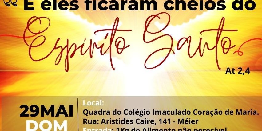 No final do mês, dia 29, último domingo de maio, a Paróquia Nossa Senhora da Conceição Aparecida, no Méier, promoverá uma grande celebração, “E eles ficaram cheios do Espírito Santo”. O evento será das 9h às 18h, e estão confirmadas as presenças de Rodrigo Torres e Davidson Silva, para animar a celebração.