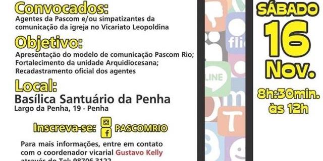A Pascom Rio vai realizar um encontro voltado para seus agentes ou pessoas que queiram fazer parte das pastorais de comunicação no Vicariato Leopoldina. O encontro será no dia 16 de novembro, na Basílica Santuário Nossa Senhora da Penha, das 8h30 às 12h. As inscrições já estão abertas e podem ser feitas nas redes sociais da Pascom Rio, no instagram ou no facebook.