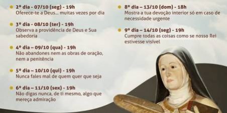 A Paróquia Santa Tereza de Jesus, no bairro de Santa Tereza, na Rua Áurea, 71, celebra nesta terça-feira, o dia da padroeira. As celebrações começarão às 10h, com a missa pelos profissionais da educação. Às 15h, vai ter o Terço da Misericórdia, às 16h, missa pelos enfermos, 19h, procissão, e às 20h, missa solene. Em todas as cerimônias vai ter a bênção e imposição do escapulário. Hoje, dia 14, às 19h, termina a novena com a reflexão “Cumpre todas as coisas como se nosso Rei estivesse visível”.