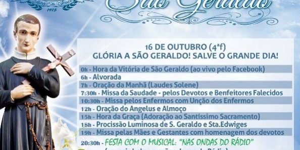 A Paróquia São Geraldo, em Olaria, programou uma grande festa para esta quarta-feira, dia 16, pelo dia do padroeiro. Vai ter a Hora da Vitória de São Geraldo, alvorada, oração da manhã e a Missa da Saudade, Missa pelos Enfermos e a Oração do Ângelus, Hora da Graça e procissão, terminando com a Missa pelas Mães e Gestantes e uma Festa Musical.
