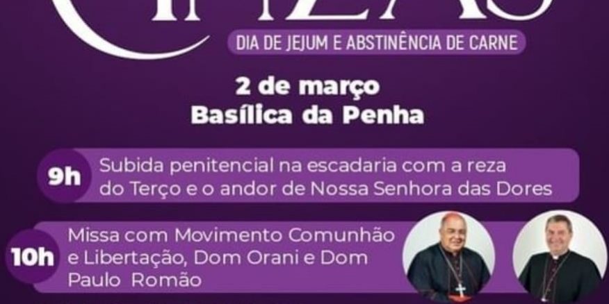Amanhã, Quarta-feira de Cinzas, o movimento Comunhão e Libertação vai celebrar a data na Basílica Santuário Nossa Senhora da Penha. A festa terá a presença do Cardeal Dom Orani Tempesta e do bispo auxiliar Dom Paulo Romão.