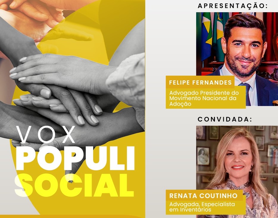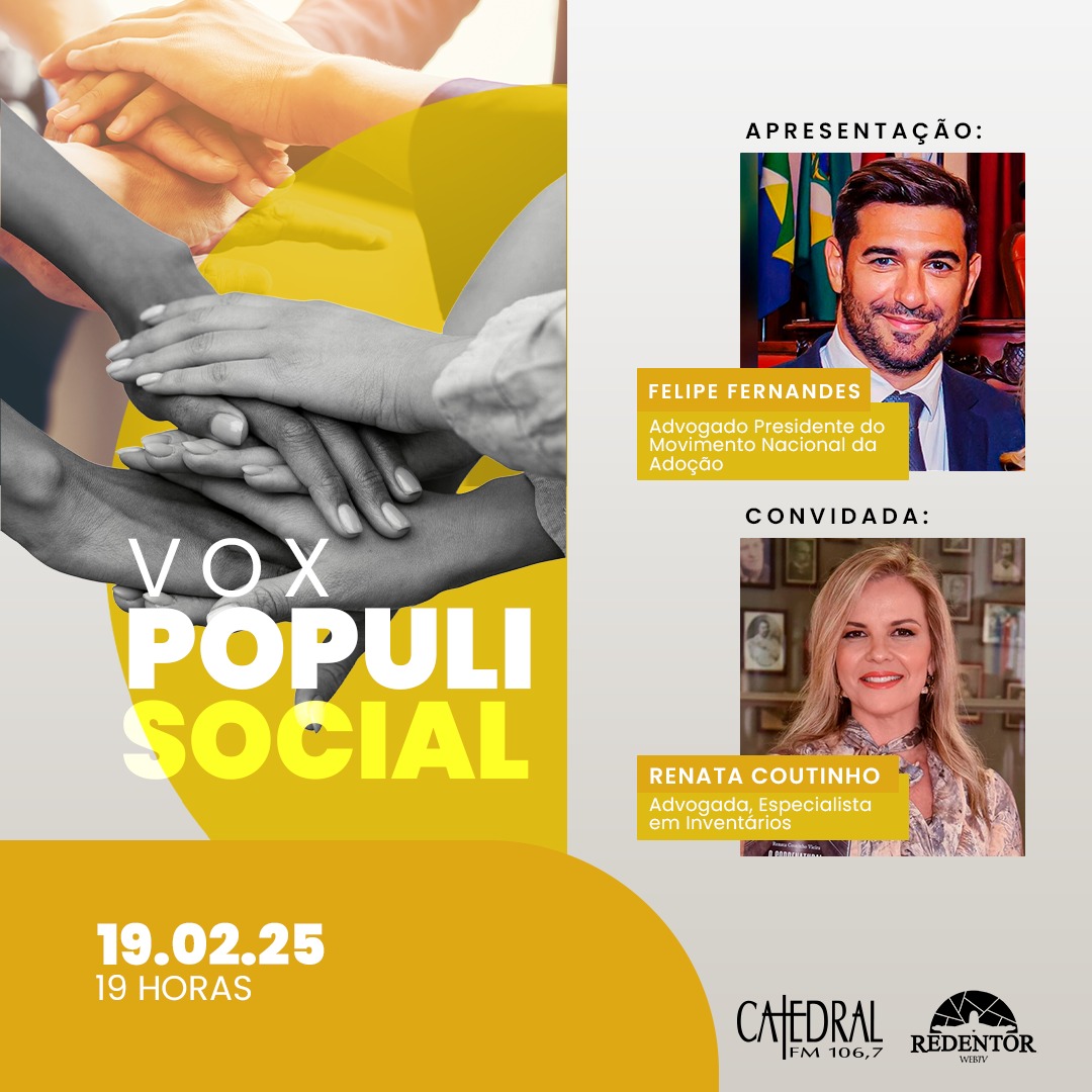 No programa Vox Populi Social desta semana, o apresentador Felipe Fernandes, presidente do Movimento Nacional da Adoção, vai receber a advogada e especialista em inventários Renata Coutinho. O programa vai ao ar todas as quartas-feiras, às 19h, e você pode acompanhar pela Rádio Catedral, FM 106,7, pela WebTV Redentor e pelas nossas redes sociais, no…