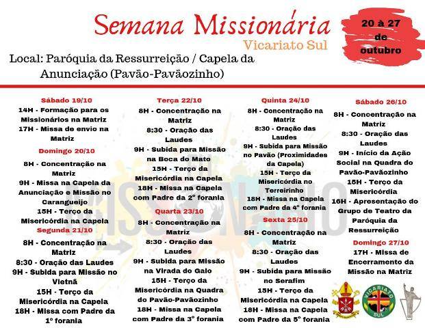 A Semana Missionária do Vicariato Sul vai ser na Paróquia da Ressurreição e na Capela da Anunciação, em Copacabana. A abertura vai ser neste sábado, às 14h, com uma formação missionária e depois a missa de envio na paróquia,às 17h. Durante toda a semana haverá missas, oração do terço, oração das laudes, na Capela da…