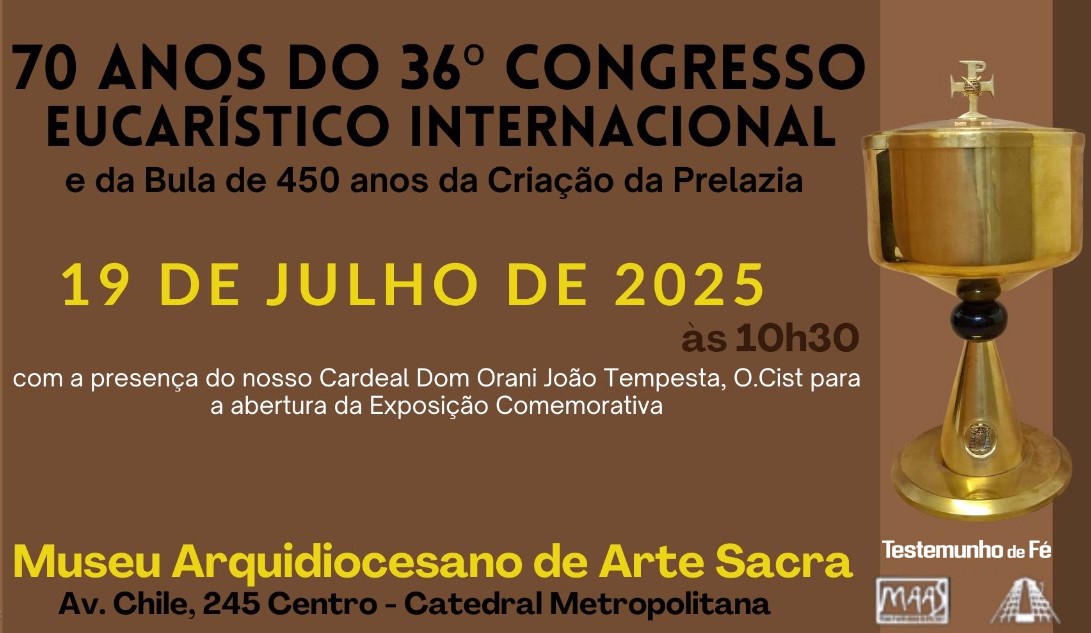 Veja maisNo sábado, na abertura do jubileu arquidiocesano do quinquênio jubilar será inaugurada a exposição “70 anos do 39º Congresso Eucarístico Internacional e a bula de 450 anos da Criação da Prelazia”. A exposição será no Museu Arquidiocesano de Arte Sacra, no subsolo da Catedral de São Sebastião. A inauguração será logo após a missa da…