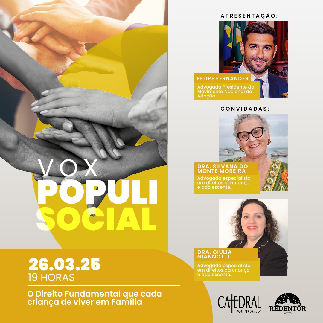 Programa Vox Populi Social, nesta quarta-feira, dia 26 de março, com o Tema: “O Direito Fundamental de cada Criança de viver em Família”, diretamente dos estúdios da Rádio Catedral FM 106,7 – Glória – Rio de Janeiro. Apresentação: Dr. Felipe Fernandes – Advogado Presidente do Movimento Nacional da Adoção Convidadas: Drª Silvana do Monte Moreira…