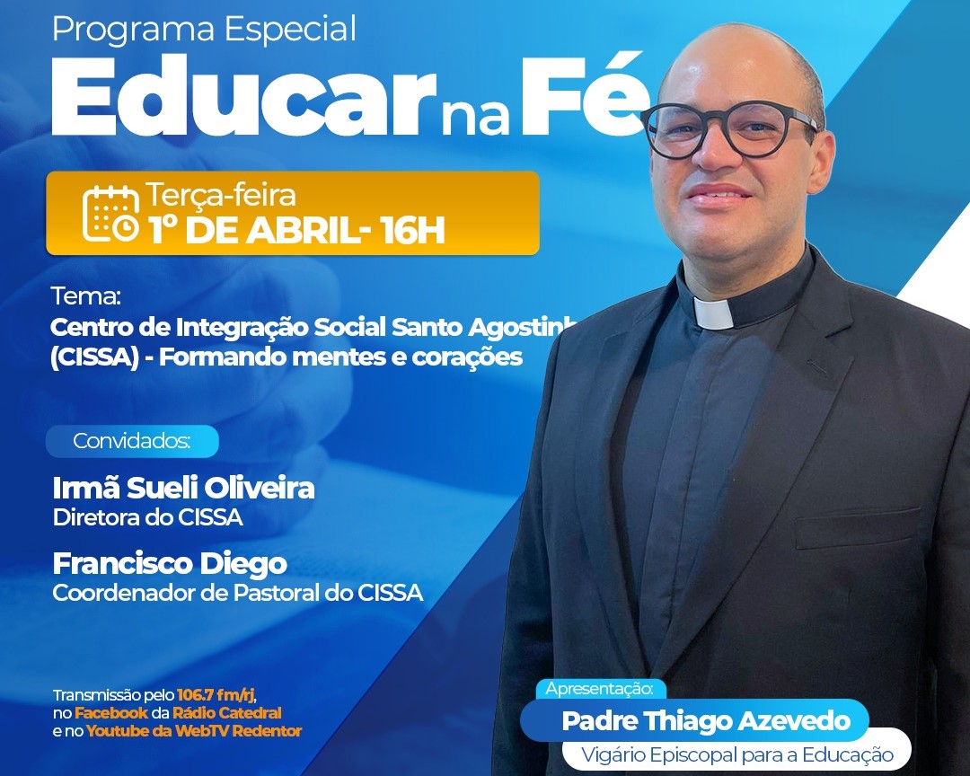 Nesta terça-feira, a Rádio Catedral vai transmitir o programa especial Educar na Fé. O Vigário Episcopal para a Educação, padre Thiago Azevedo, vai receber a diretora e o coordenador de pastoral do Centro de Integração Social Santo Agostinho, que vão falar sobre o CISSA, formando mentes e corações. O programa Educar na Fé vai ao…