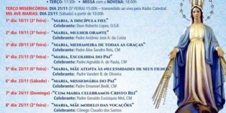 Começa hoje, dia 18, a novena de preparação para a festa de Nossa Senhora das Graças, no Santuário de Nossa Senhora da Graças da Medalha Milagrosa, na Rua Doutor Satamini, 333, na Tijuca. A novena vai até o dia 26, com missa, às 7h e 19h, e terço às 18h30. No domingo, ela acontecerá na missa das 8h30, na Missa da Juventude, às 10h, terço às 17h30, e Missa com a novena, às 18h. A festa de Nossa Senhora das Graças é comemorada no dia 27 de novembro.