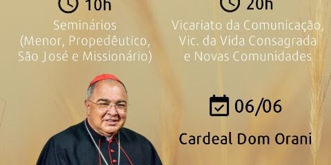 O Cardeal Dom Orani Tempesta preside a Hora Santa, pela Semana Eucarística, neste sábado, em dois horários: 10h, Seminários Menor, Propedêutico, São José e Missionário, e às 20h, Vicariato da Comunicação, Vicariato da Vida Consagrada e Novas Comunidades.