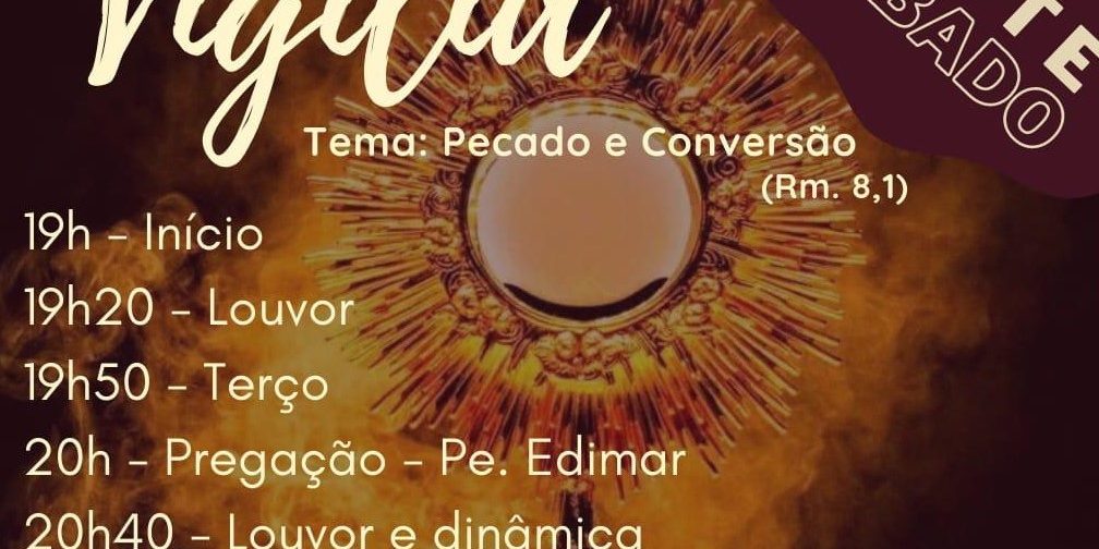 Neste sábado vai ter uma vigília com o tema “Pecado e Conversão” na Paróquia Divino Espírito Santo e São João Batista, no bairro do Maracanã. A vigília terá início às 19h, com um louvor, e depois será rezado o terço, vai ter uma pregação com o padre Edimar, seguida de louvor e dinâmica, testemunho, e terminará com a adoração ao Santíssimo Sacramento.